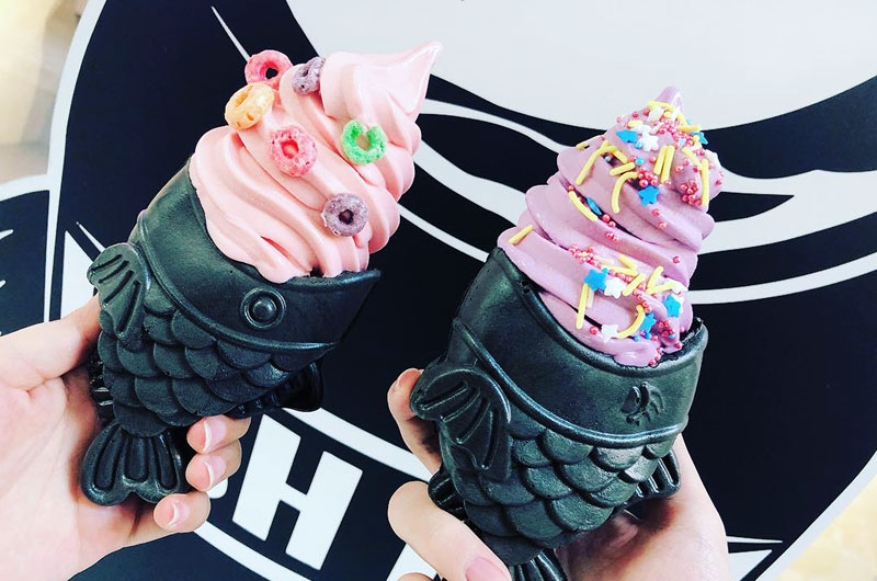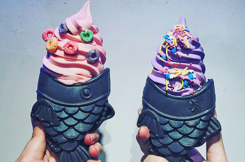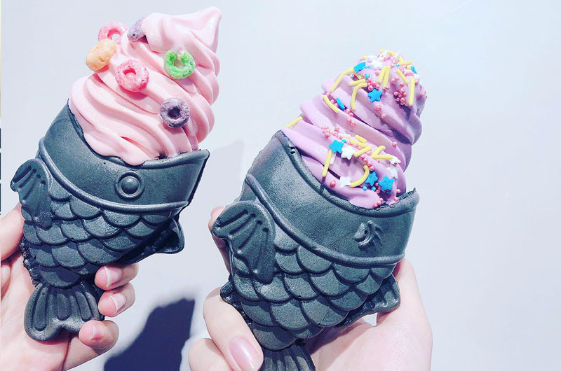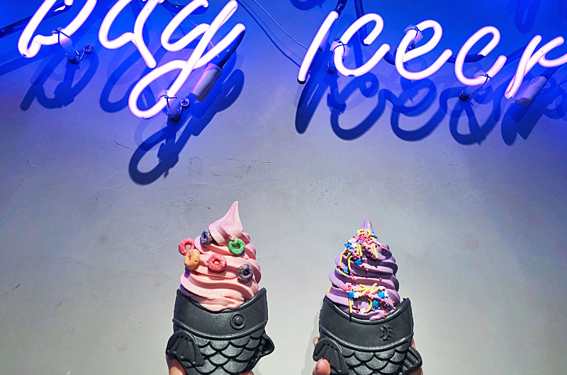 雖然說是美式霜淇淋, 但看起來更像日式, 鯛魚燒非常特別用竹炭當底還加了紅豆, 冰淇淋吃到一半後, 就會有滿滿的紅豆很特別, 口味也很特別,有獨角獸之類的,可惜這次來沒有提供, 每天都提供兩樣不同口味的冰,這次是藍莓優格 還有草莓優格, 除了口味配料也可以 自由搭配,不過要加錢哈哈, 完全是客製化可以創造屬於自己的冰淇淋, 讓夏天的炎熱徹底消除, 特定節日還有特別口味超Q。